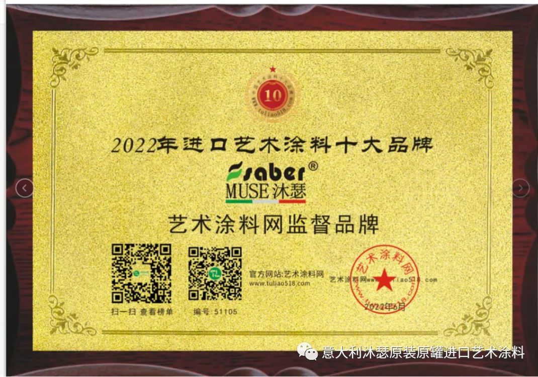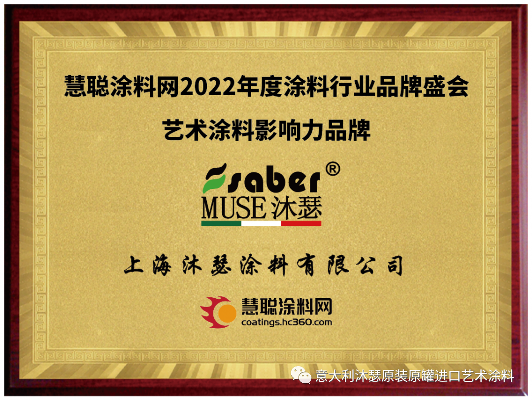 2022年,沐瑟分别获得“2022年进口艺术涂料十大品牌”及“2022年艺术涂料行业最具影响力品牌”。