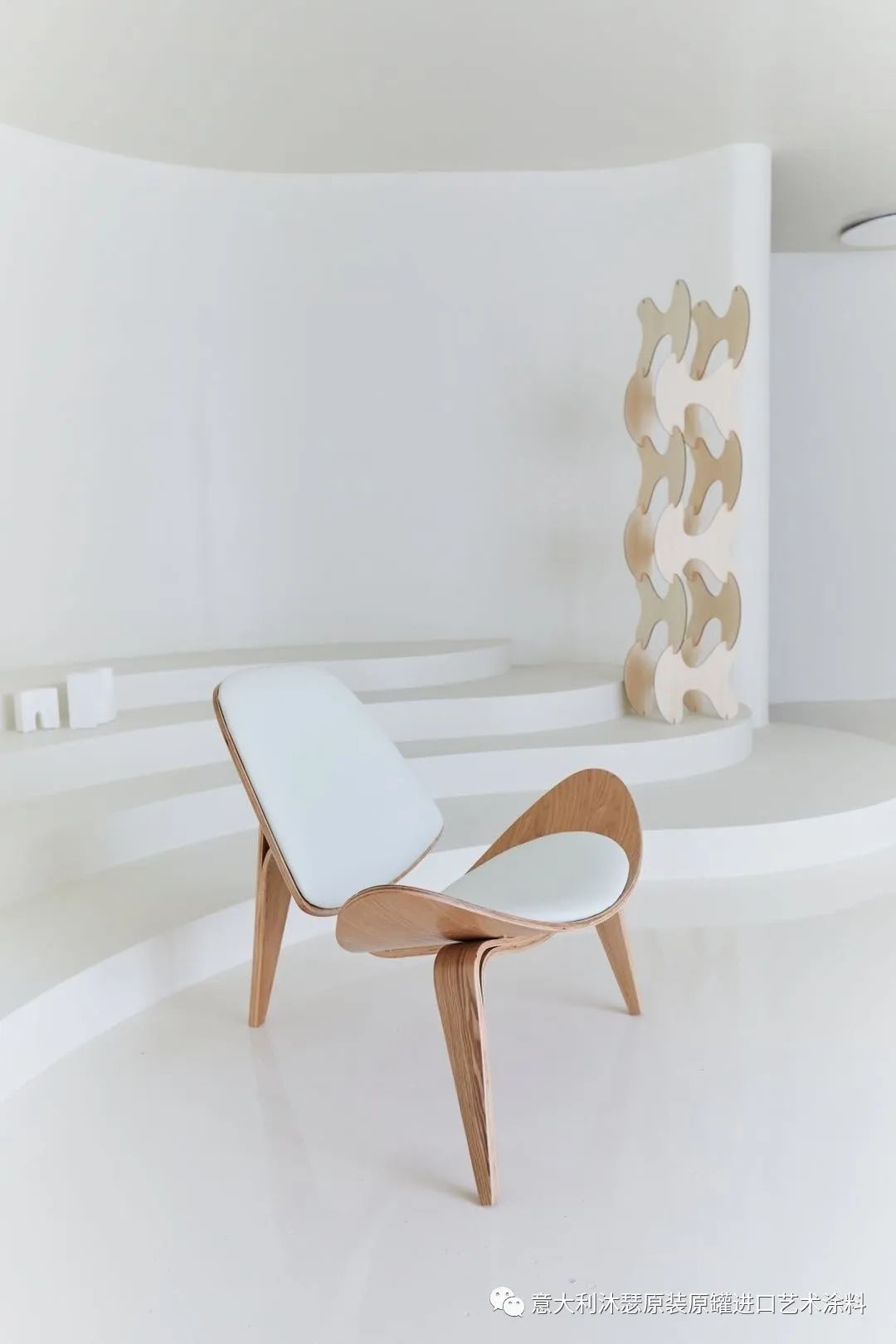 二楼是清新、自然的区域,乳白色、粉色和米色艺术涂料成为空间中的“主角”。